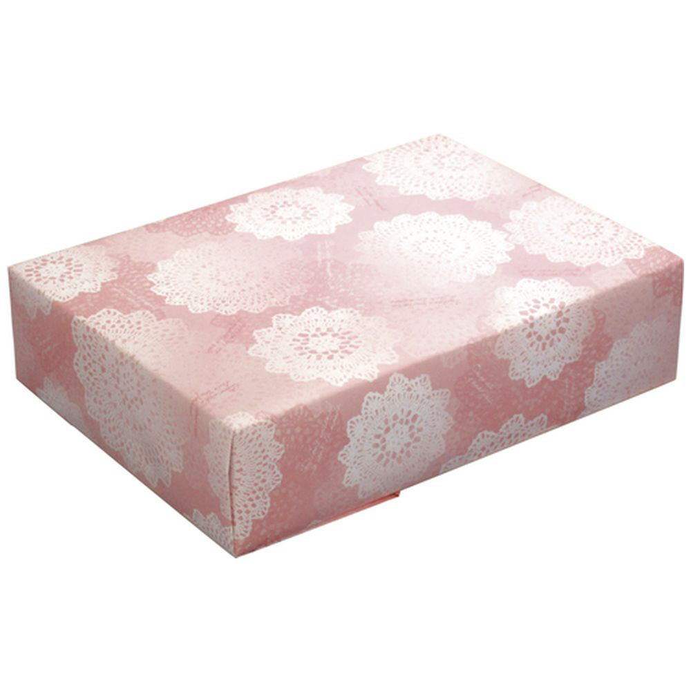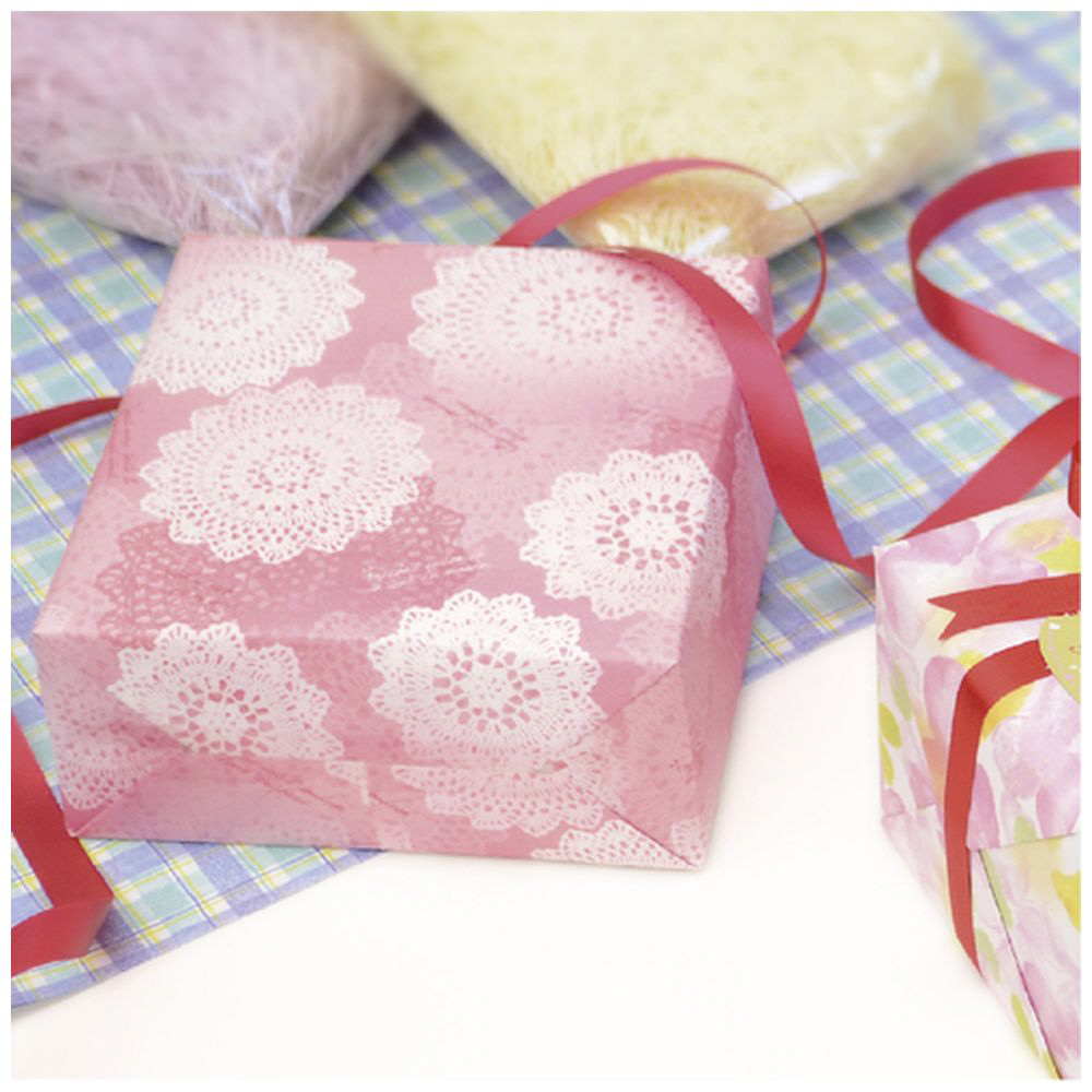 ■美しいレース柄の包装紙です。ピンクに重ねられたレースのデザインです。
