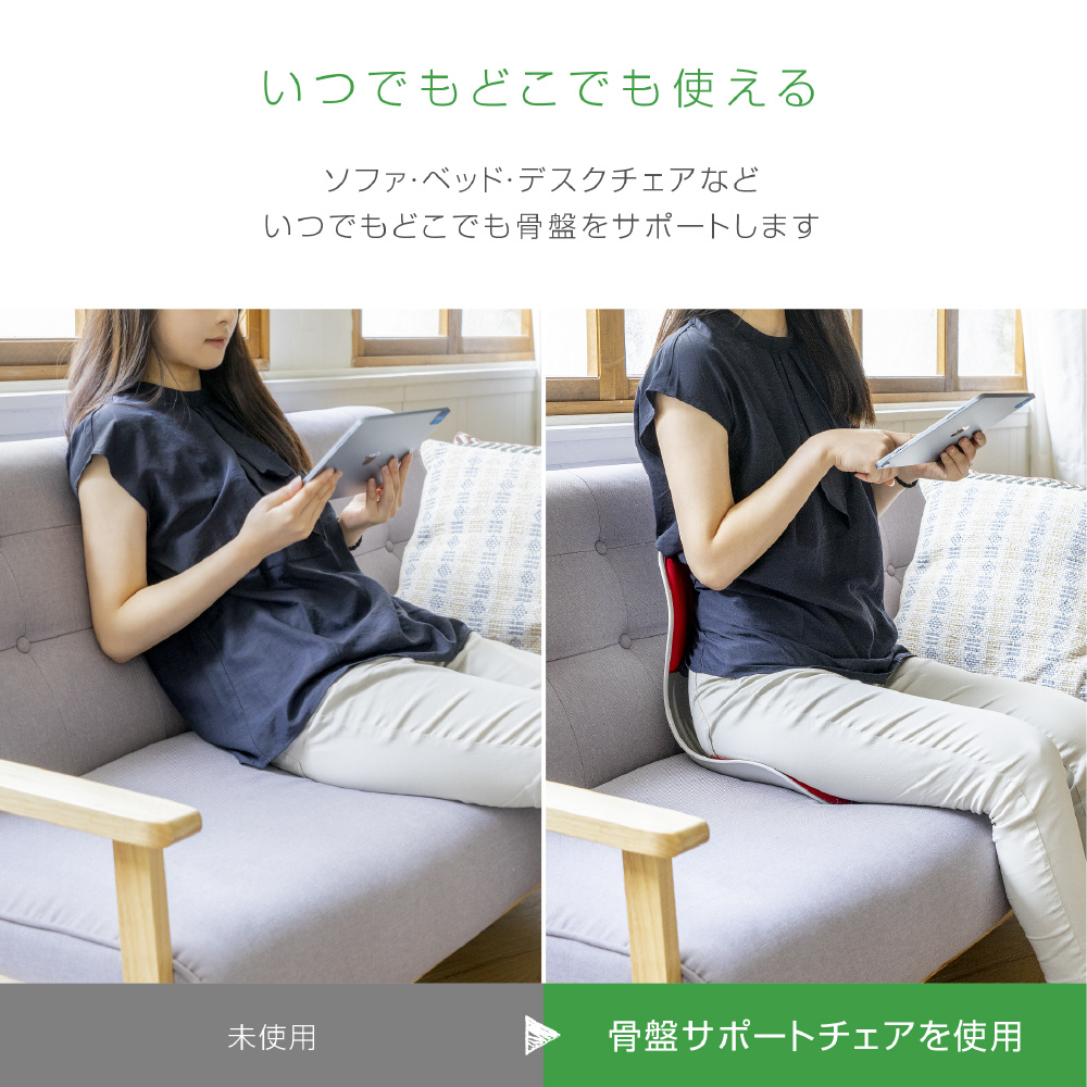 ソファ、ベッド、デスクチェア、ダイニングチェア、カーペットの上など、いつでもどこでも骨盤をサポート。