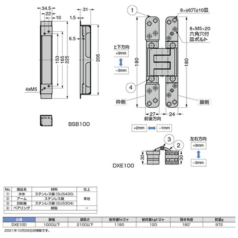 DXE100/ステンレス鋼製 三次元調整機能付隠し