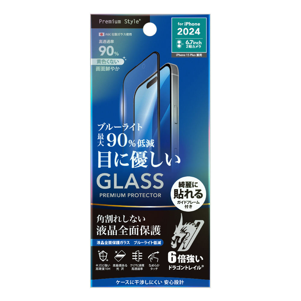 iPhone 16 Plus 液晶全面保護ガラス 角割れ防止PETフレーム Dragontrail Premium Style ブルーライトカット/高透明 PG-24CGLF02BL