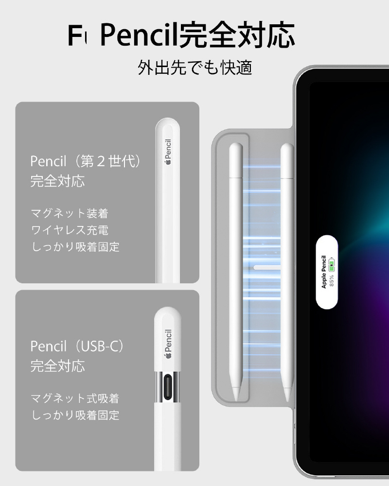 Pencil Proへ完全対応かつ、磁気充電用の側面の溝と、Pencilをしっかりと固定するマグネットクラスプを備えています。