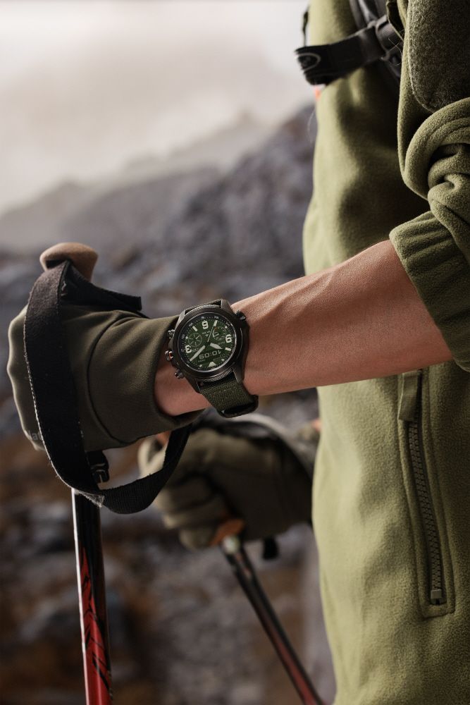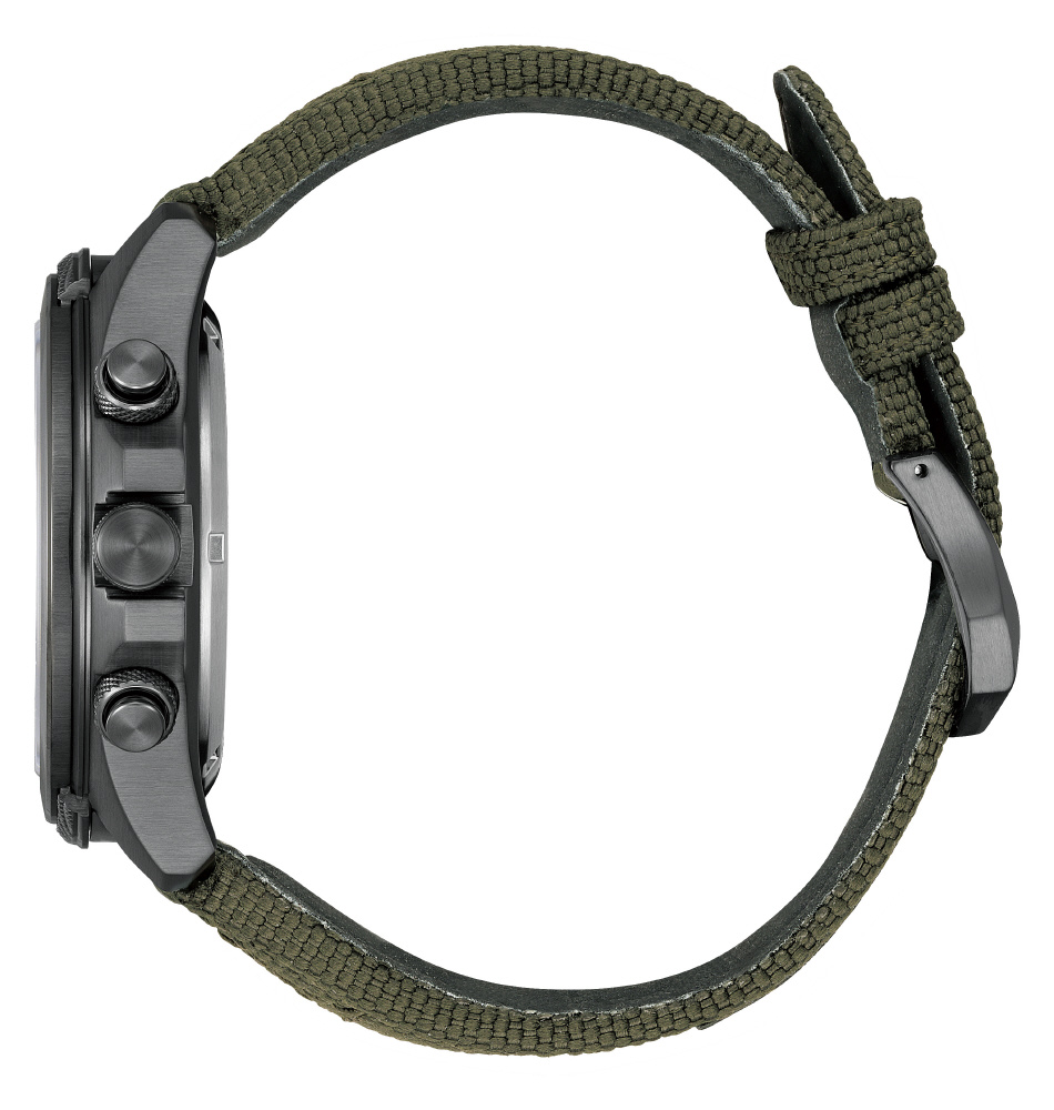 ■耐久性の高いコーデュラバンドを合わせたカーキ色の文字板。