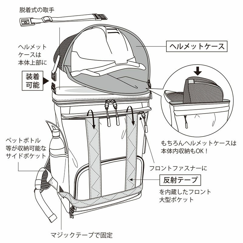 内臓式の反射テープ取付・ヘルメット収納可能。