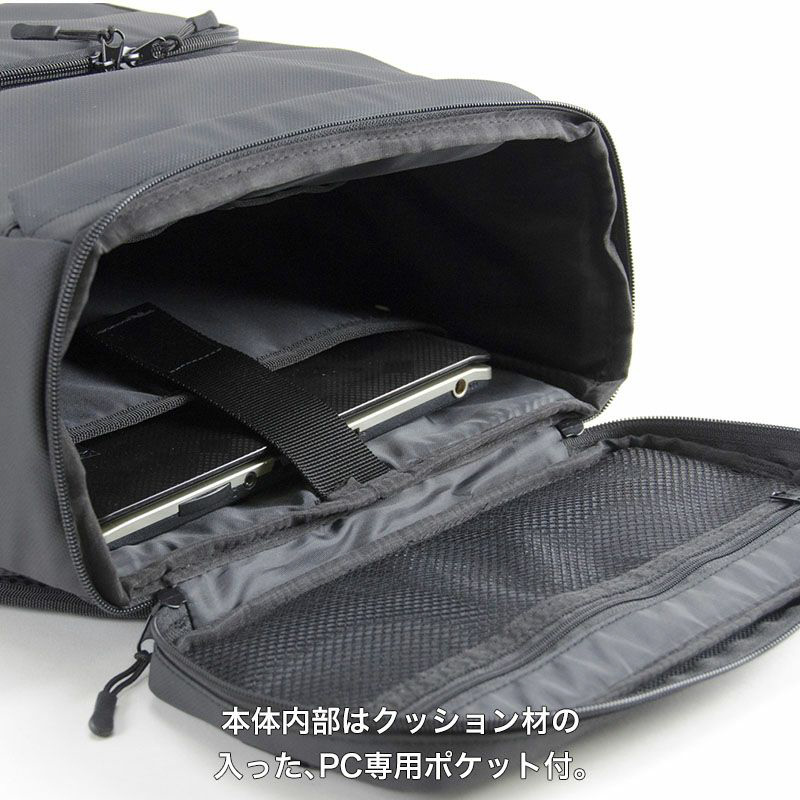 クッション材の入ったPC収納ポケットとメッシュ素材の内部収納ポケットを配置しております。