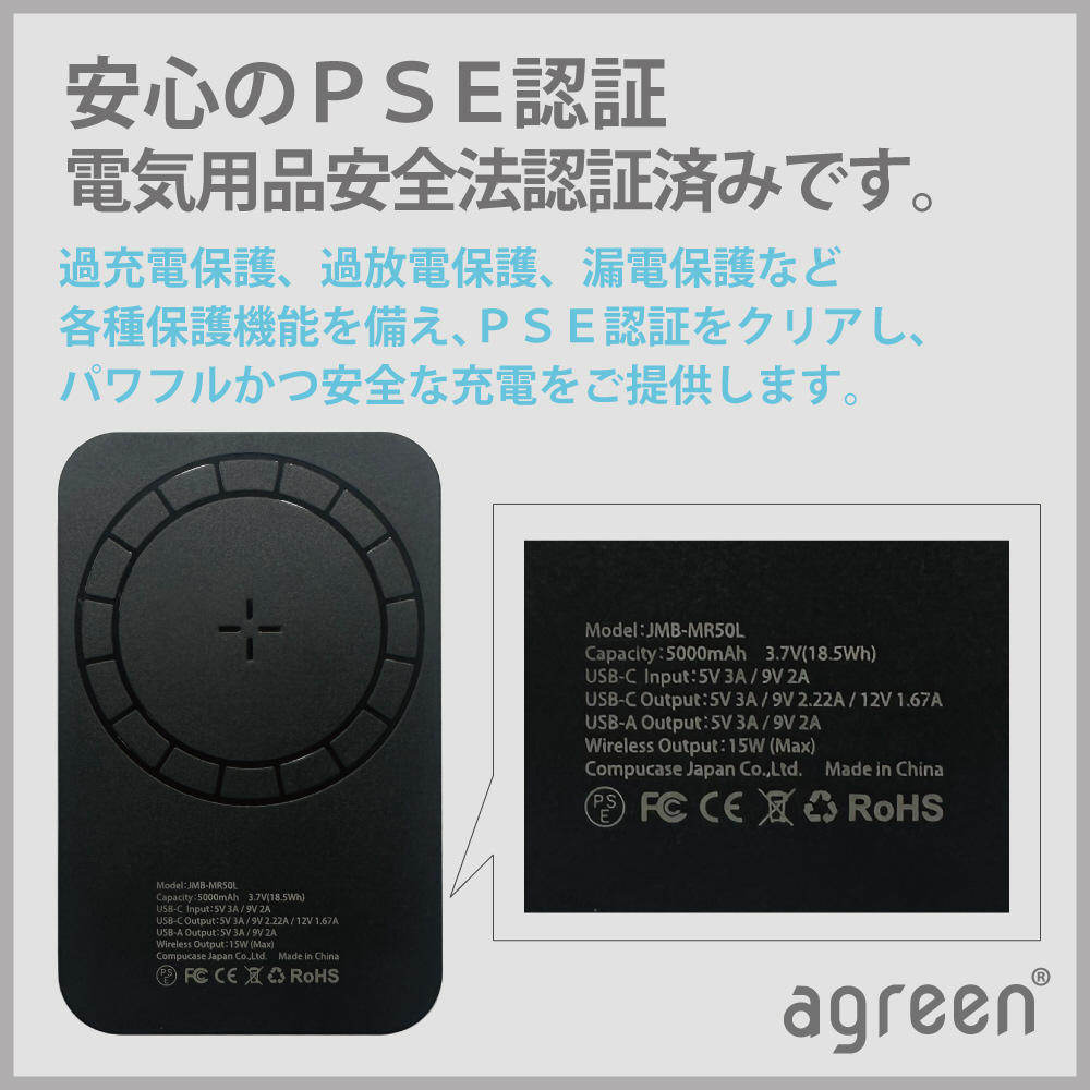 スタンドにもなるリング付きマグセーフ15W 5000mAh PD20Wモバイルバッテリー agreen ホワイト JMB-MR50L-WH