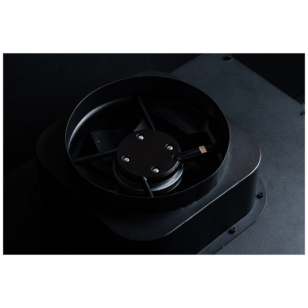 風量は簡単に言うと(風速?制気口の面積)で算出されます。<br>この掛け算が意味するところは明白ですが、プロペラファンの進化のうち「小型化」は200mm径ファンの搭載という選択肢ももたらしてくれました。<br>これまで一般的な卓上塗装ブースは100mm〜150mm径のものが主流でしたがもう一歩先の口径、200mm径ファンを搭載することによりこの掛け算の答えを大きく変えることに成功しています。<br>排気の取り回しの都合で200mm→150mm径への変換をかましたとしてもこの答えは大きくは変わりません。