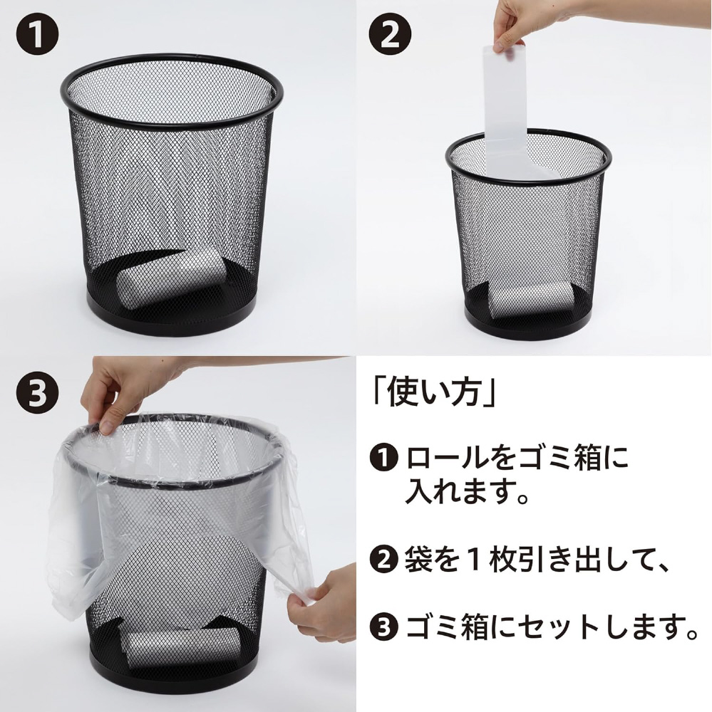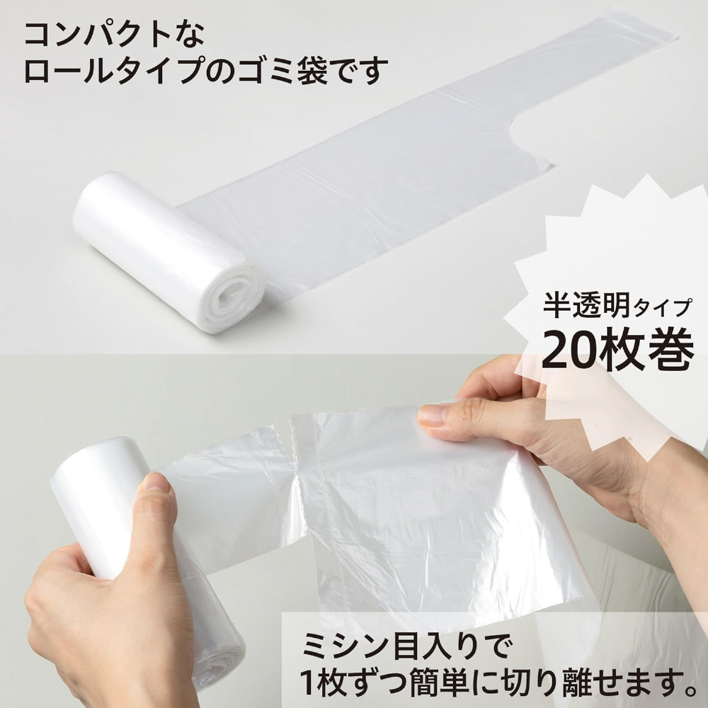 ●ゴミがいっぱいになったら袋を持ち上げて、次の袋とミシン目でカットして切り離します。●20枚のポリ袋がコンパクトなロール状に!ゴミ箱の底に置けて便利です。●ロールから引き出してゴミ箱に装着できるので手軽にお使い頂けます。袋の取替がラクにできます。●袋の取替がラクにできます。お得な手さげタイプ30Lの4本パック