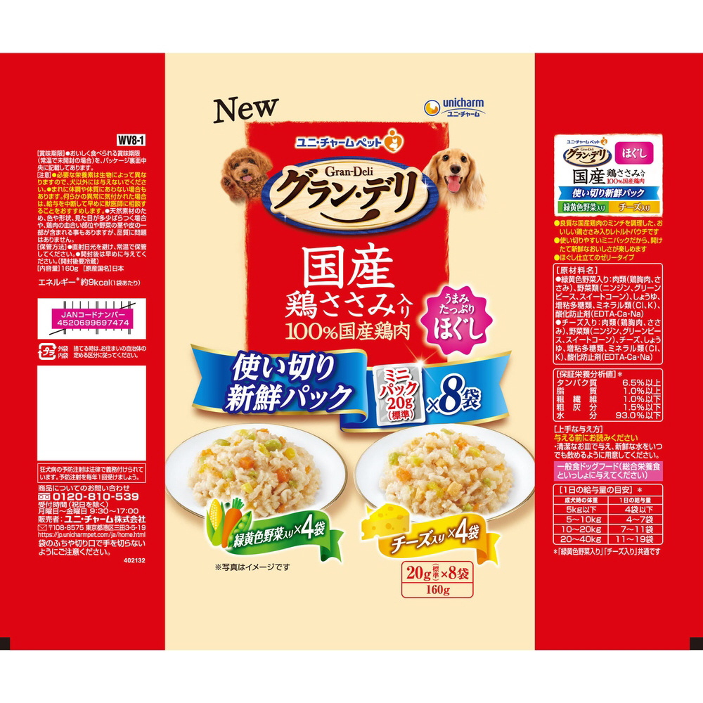 グラン・デリ 国産鶏ささみ入りパウチ 使い切り新鮮パック ほぐし 成犬用 緑黄色野菜入り&チーズ入り 160g(20g×8)