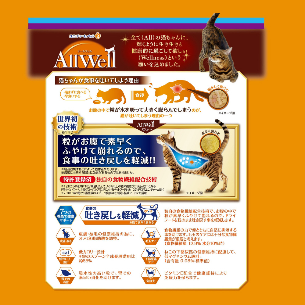独自の食物繊維配合技術で、お腹の中で粒が素早くふやけて崩れるので、ドライフードを粒のまま吐き戻す事を軽減します。