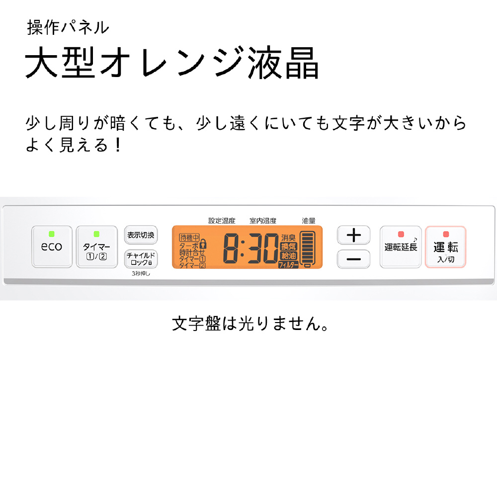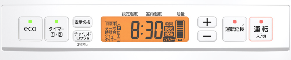 安全機能 不完全燃焼防止装置、対震自動消火装置、停電安全装置、過熱防止装置、燃焼制御装置、点火安全装置、消し忘れ消火装置、気密油タンクの給油時消火装置