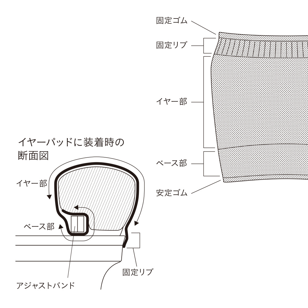 カバーは一体成型のため縫い目による凹凸がなく、吸水性に優れたやさしい肌触りの編地により、ヘッドホン装着時の汗や蒸れの不快感を軽減し、快適な装着感を提供します。