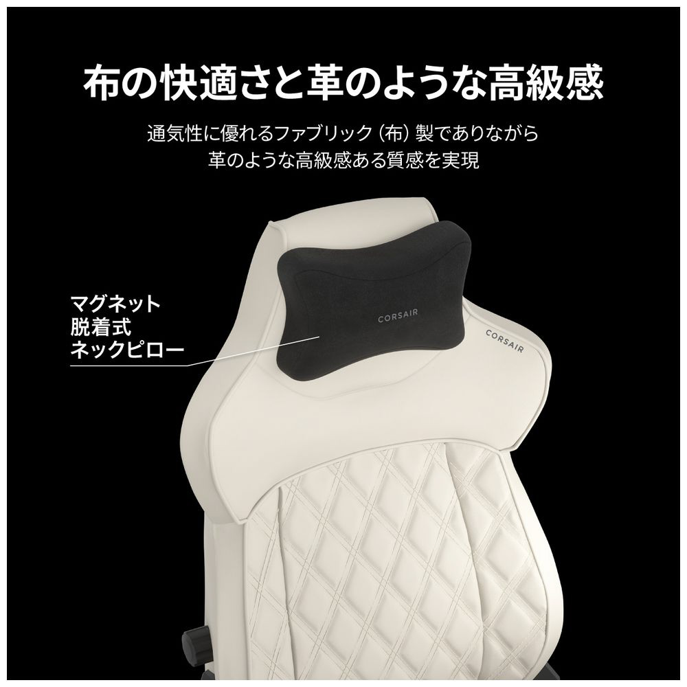 通気性の高いファブリック素材は、革のような高級感のある質感でありながら長時間座っていても蒸れにくく、快適な座り心地を実現します。マグネット式のヘッドレストは簡単に脱着が可能です。