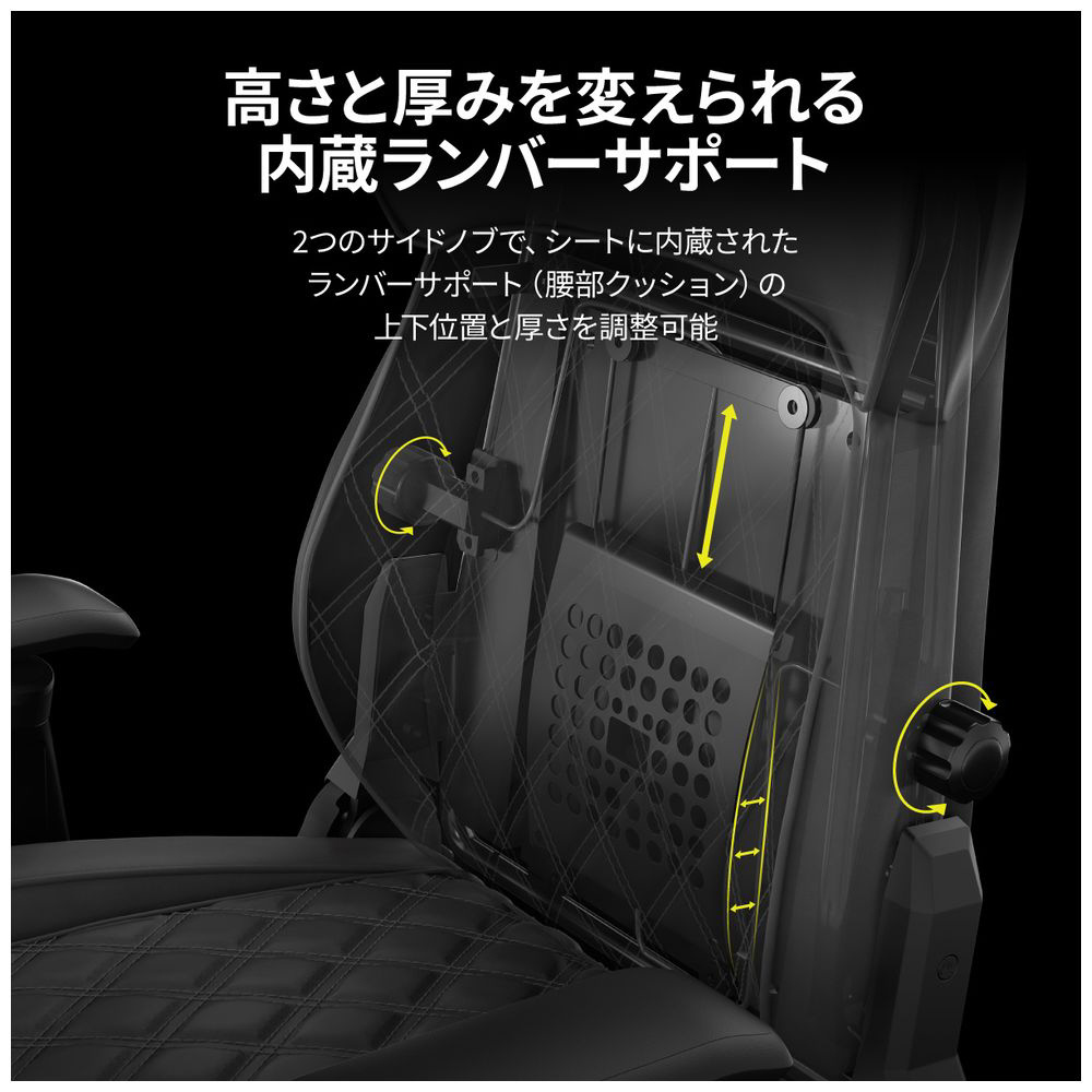 腰部を支え、長時間の作業を快適にするランバーサポートをシート本体に内蔵。左右のノブを調節することで、上下位置やクッションの厚みをお好みに合わせて変更可能です。