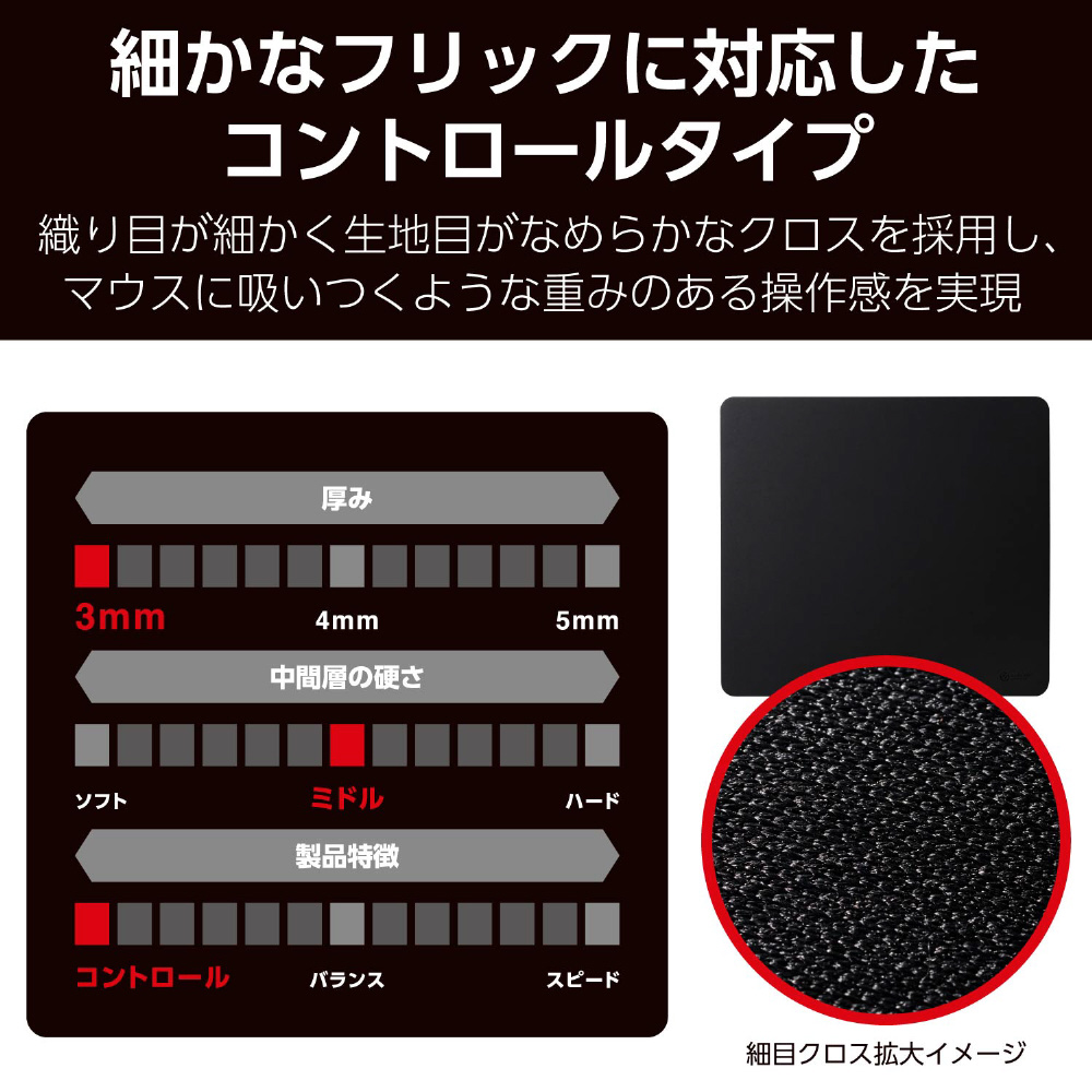 織り目が細かく生地目がなめらかなクロスを採用し、マウスに吸いつくような重みのある操作感を実現。細かなフリックに対応した、コントロールタイプのELECOM GAMING ゲーミングマウスパッドです。