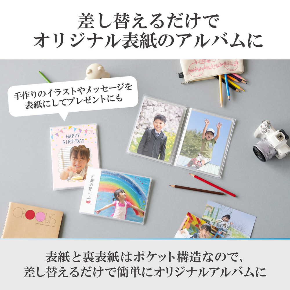 ポケット構造になっているので、表紙の写真をお気に入りの1 枚に入れ替えるだけで簡単にオリジナルのアルバムがつくれます。思い出を共有したい人へのプレゼントにも最適です。
