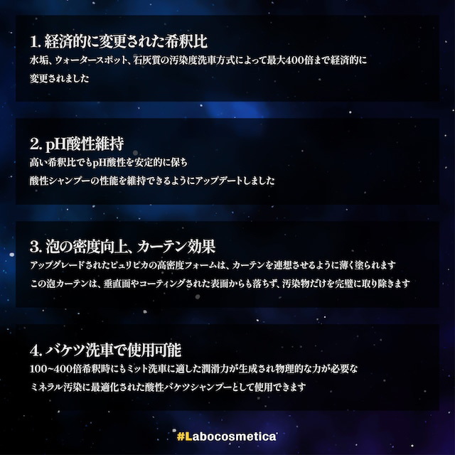 酸性のプレウォッシュ剤。洗車前に酸性の泡をかける事により、無機質汚れを分解します。また、コンタクトウォッシュにも使えます。