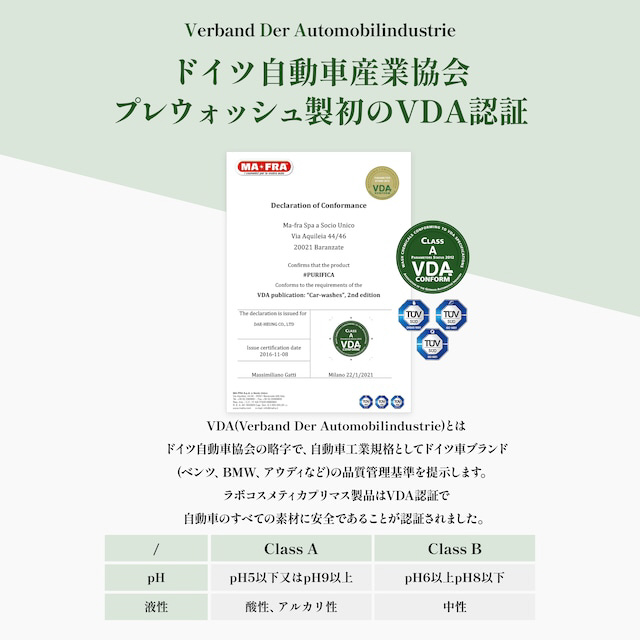 ディテール分野で初の「VDA認証」を与えられたプレウォッシュ剤です。VDA認証は、ドイツの自動車協会による認証で、最もデリケートな自動車やバイクなどに使用できるケミカルであることを証明する認定書です。