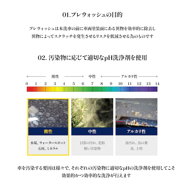 車を汚染する要因は様々で、それぞれの汚染物に適切なpHの洗浄剤を使用してこそ、効果的かつ効率的な洗浄が行えます。