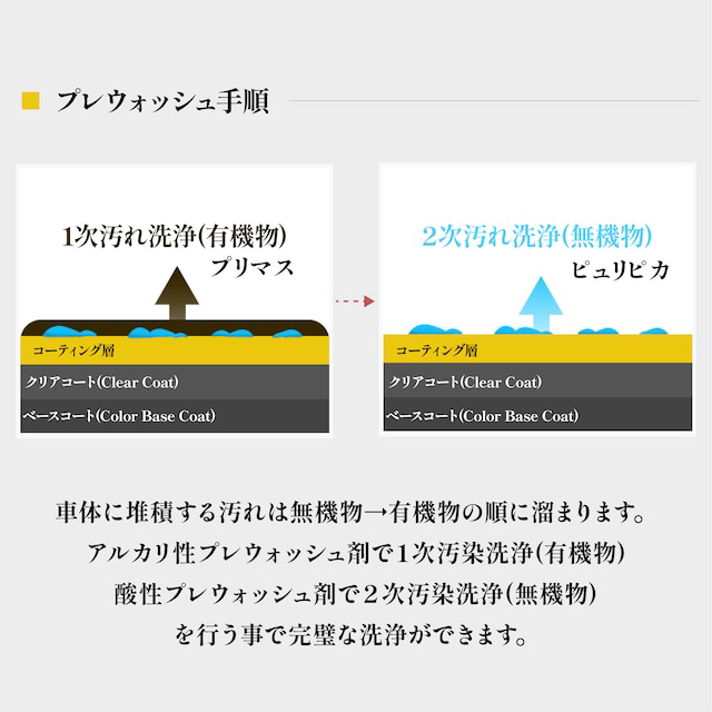 プレウォッシュは本洗車の前に車両塗装面になる異物が原因となり、物理的な洗車傷の発生リスクを低減させる為のものです。