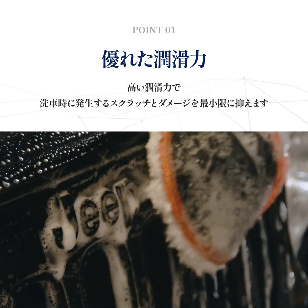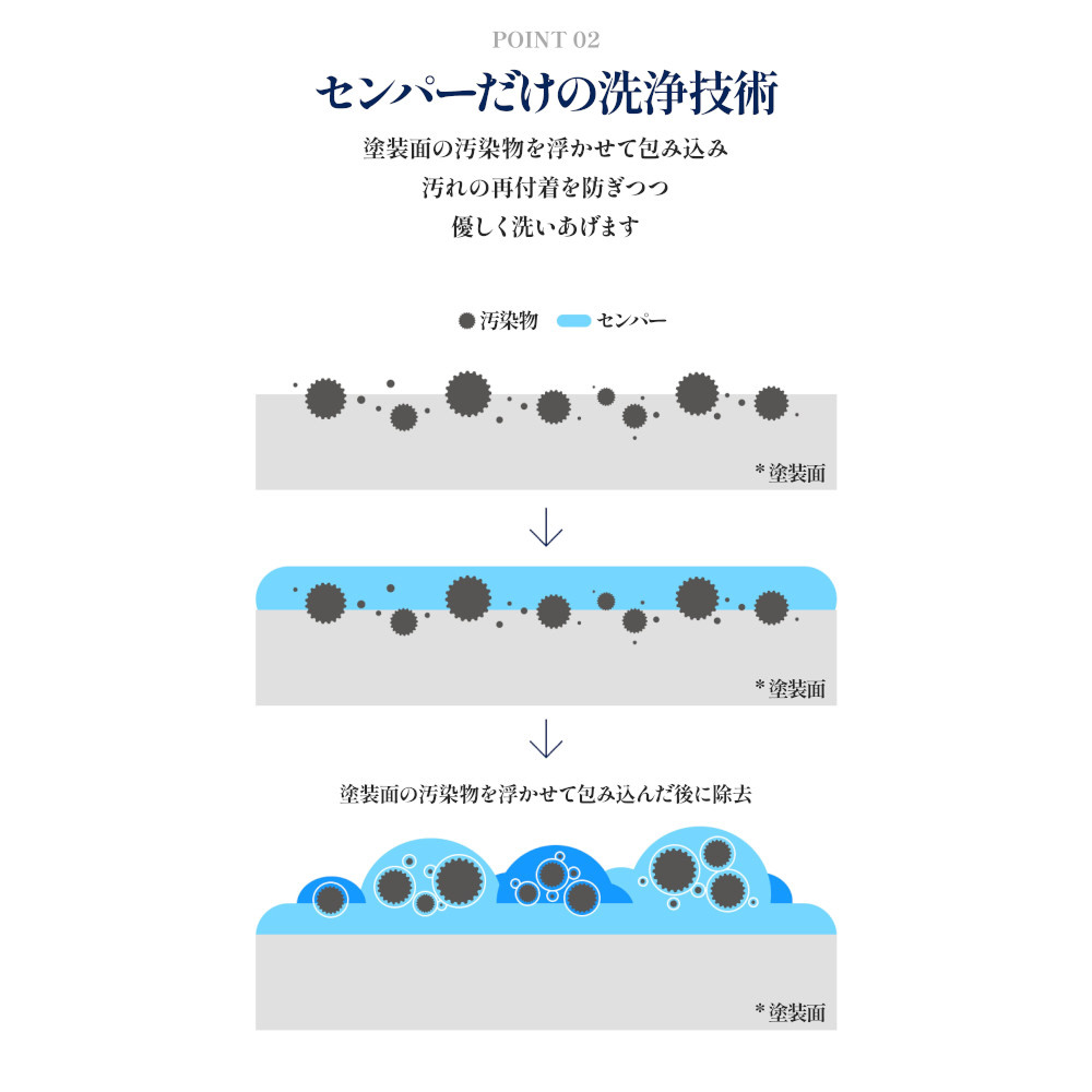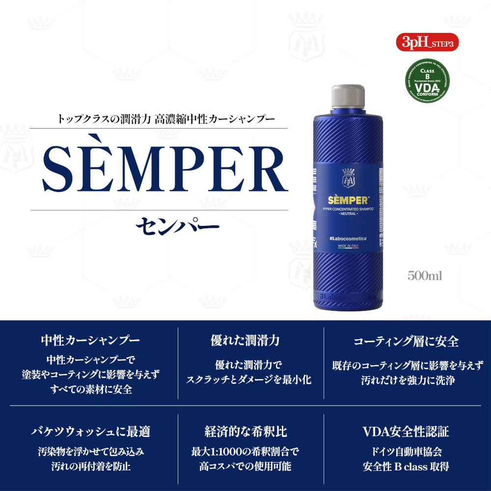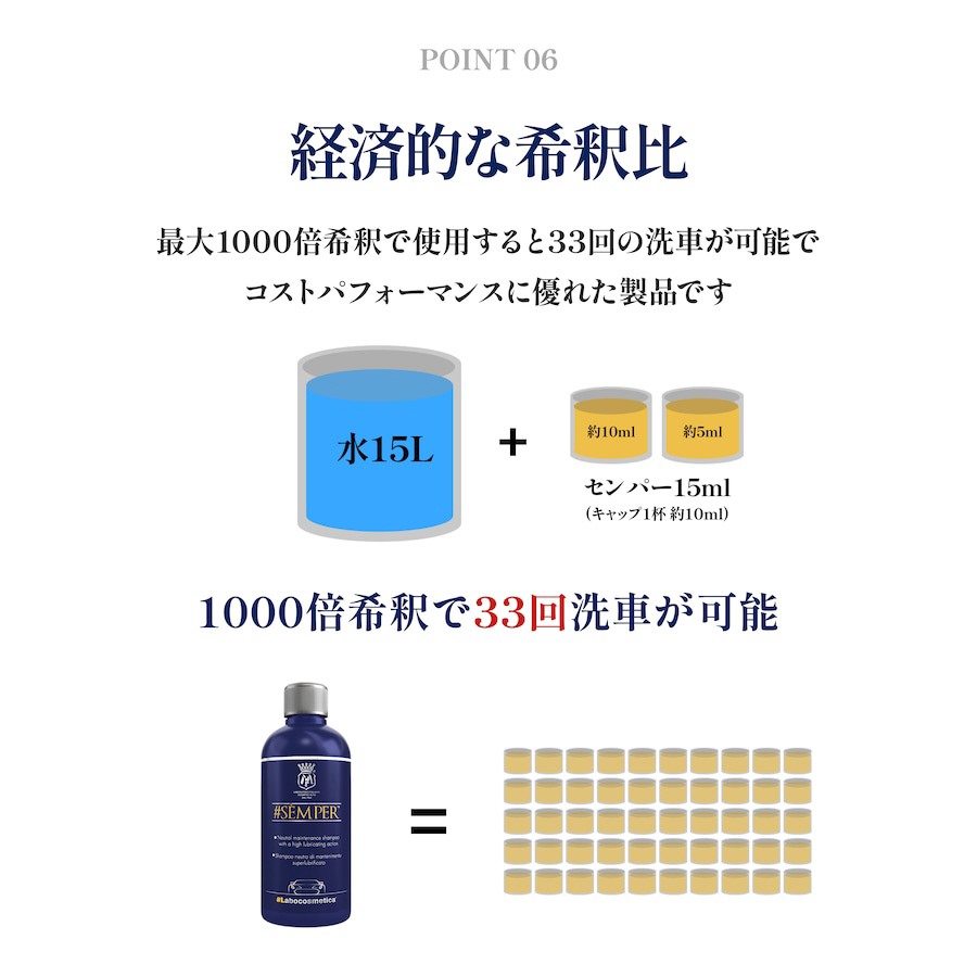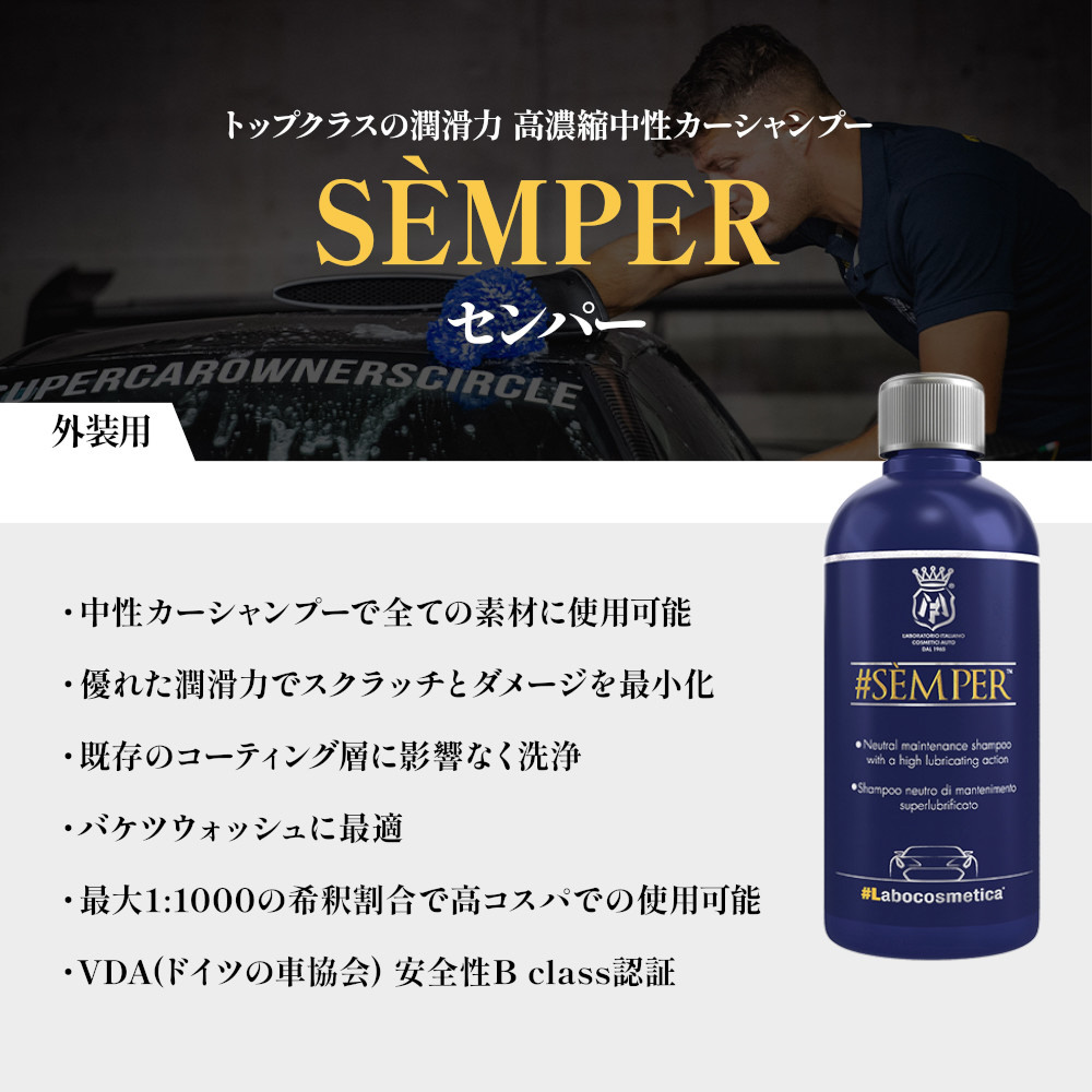 最大1000倍希釈での使用が可能な高濃縮タイプで、優れた洗浄力と優しい香りが特徴のセンパーは既存のコーティング層や車体に完璧な安全性を誇ります。