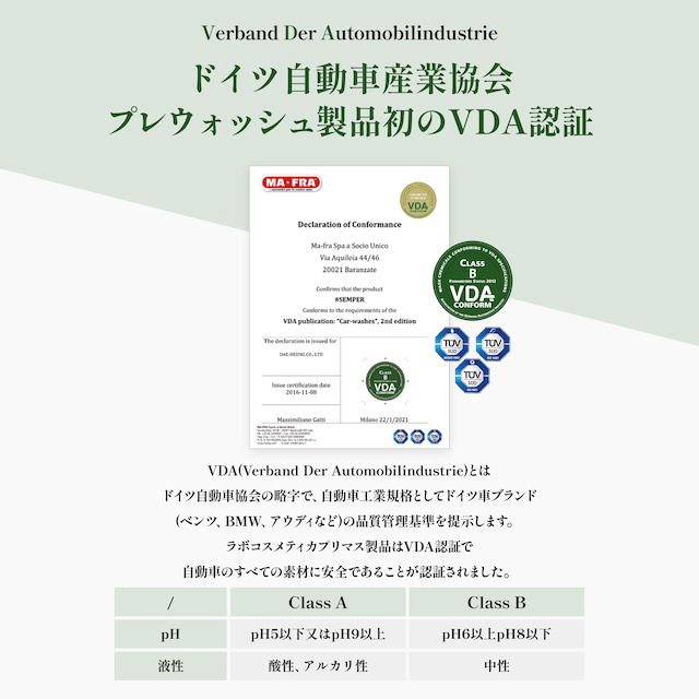 VDA認証class Bを取得した本製品は車体への安全性が認められた製品で様々な環境下での使用でも車体にダメージを与えません。