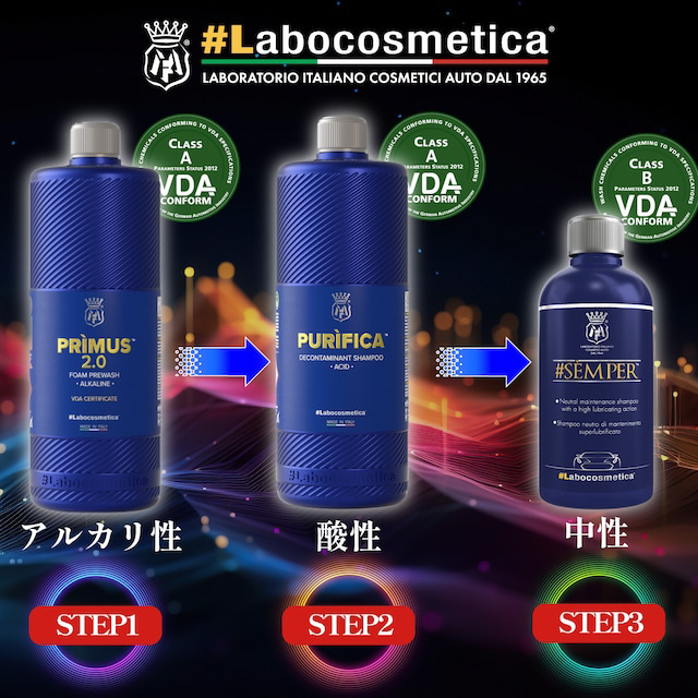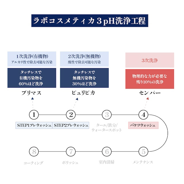 単品での使用はもちろん、ラボコスメティカが推奨する「3pH洗車」に最適な製品です。