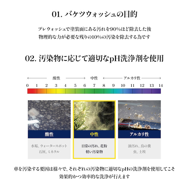 車を汚染する要因は様々で、それぞれの汚染物に適切なpHの洗浄剤を使用してこそ、効果的かつ効率的な洗浄が行えます。