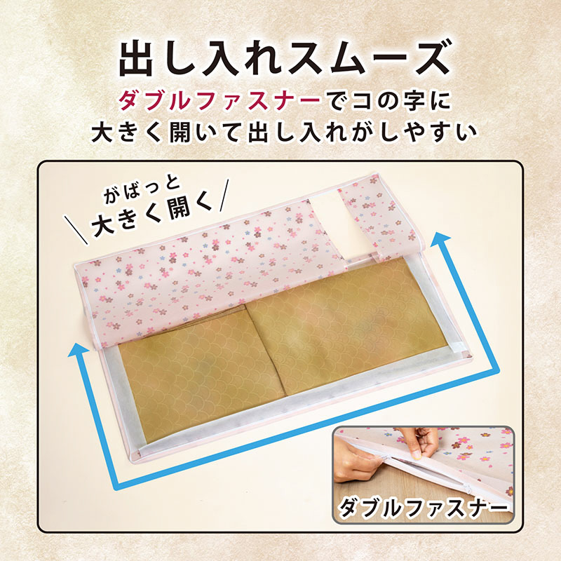 ダブルジップファスナーで3辺が開くので着物の出し入れがスムーズ。ファスナーによる挟み込みを防ぐ布付き。