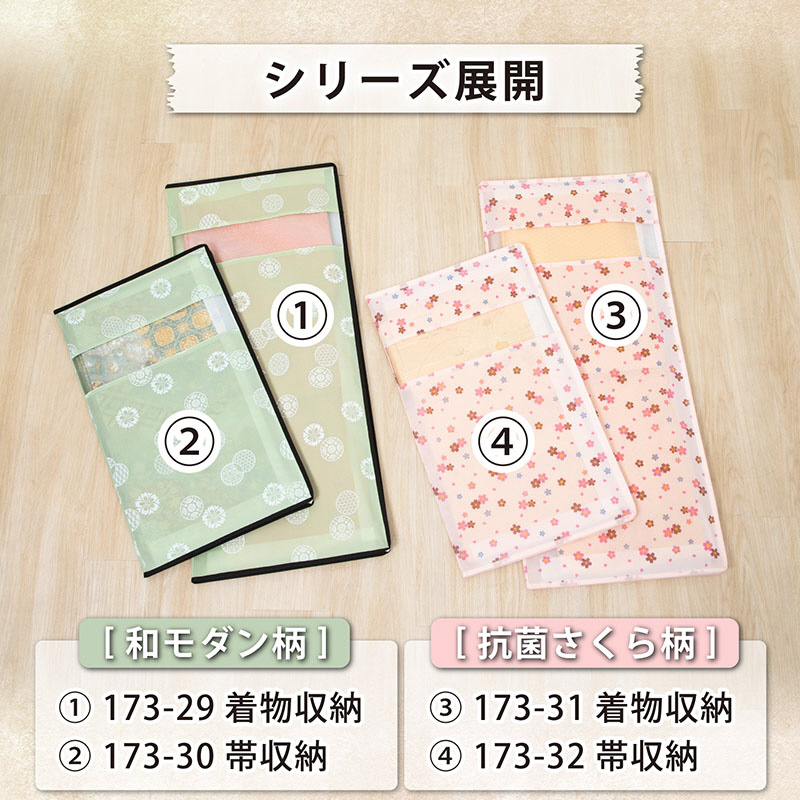 透明窓付きで収納したまま中身の確認ができる。淡いグリーンの生地にオリジナルのモダンな和柄をプリント。使わないときは折りたためてコンパクトになるので場所を取らずに保管可能。浴衣や振袖などの収納にも使える。