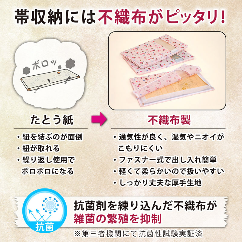 通気性が良く湿気やにおいのこもりにくい不織布製の帯収納袋。大切な着物の帯をホコリから守り保管。