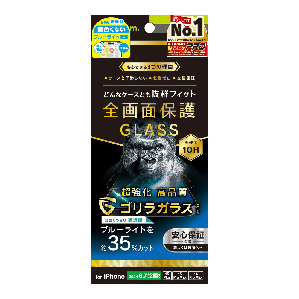 iPhone 16 Plus(6.7インチ)ケースとの相性抜群 ゴリラガラス 黄色くないブルーライト低減 画面保護強化ガラス 光沢 TR-IP24L2-GLS-GOB3CC