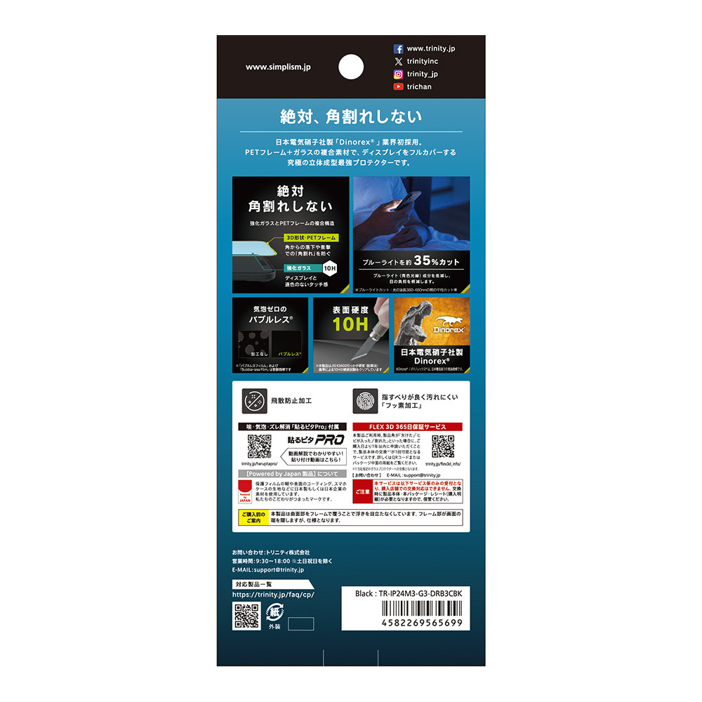 角割れしない ダイノレックスガラス採用 PETフレーム 立体成型プロテクター ブルーライト低減 高透明