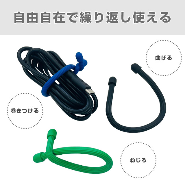 ねじって袋止めにしたり、曲げて S 字フックのようにしたりコードに巻きつけてまとめたりと自由自在に形を変えて繰り返しお使いいただけます。