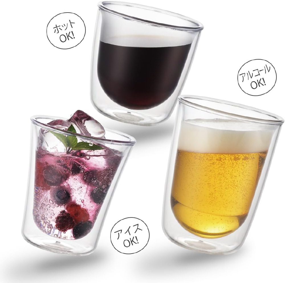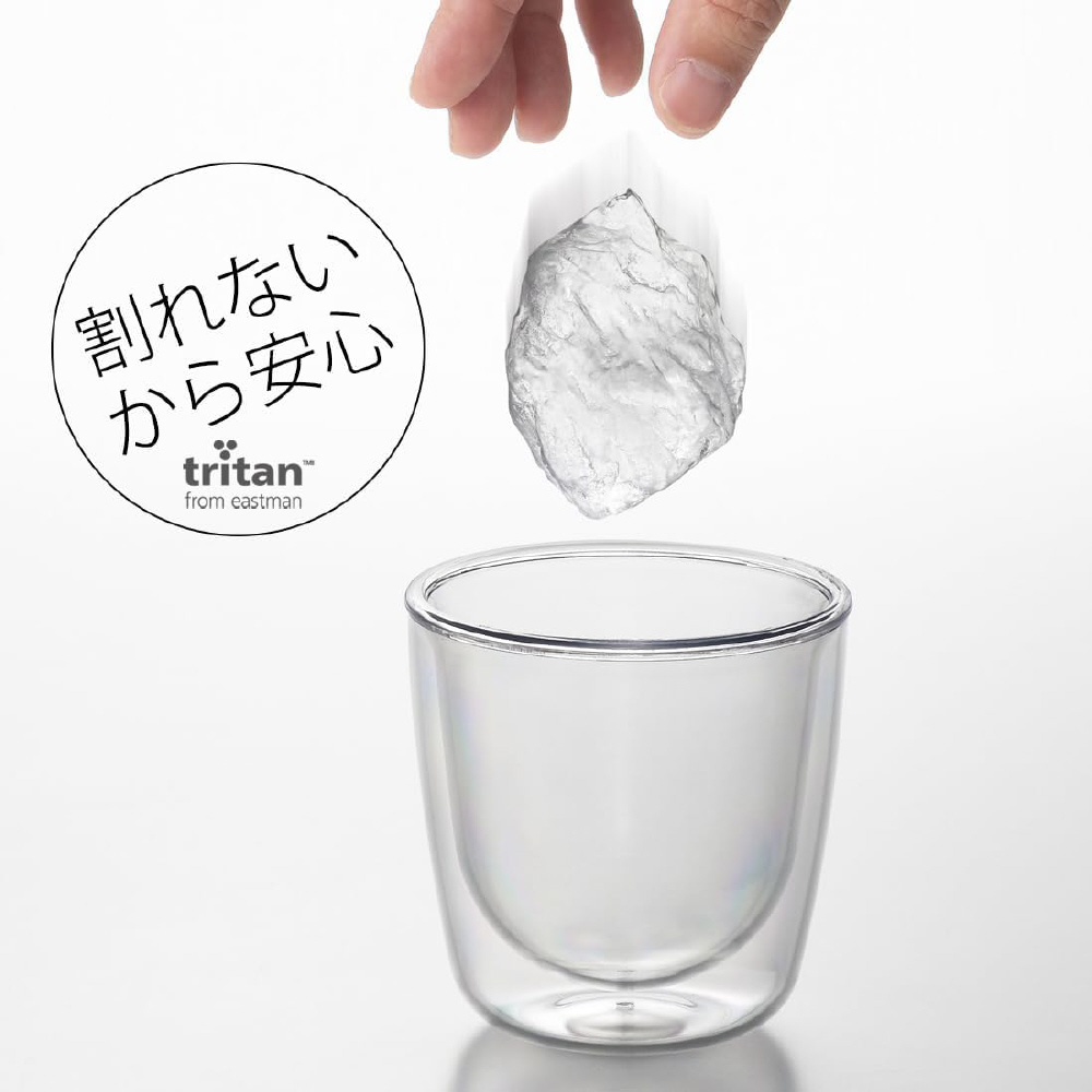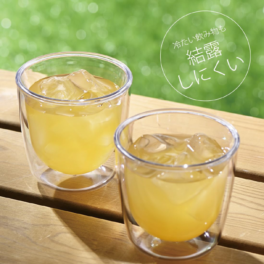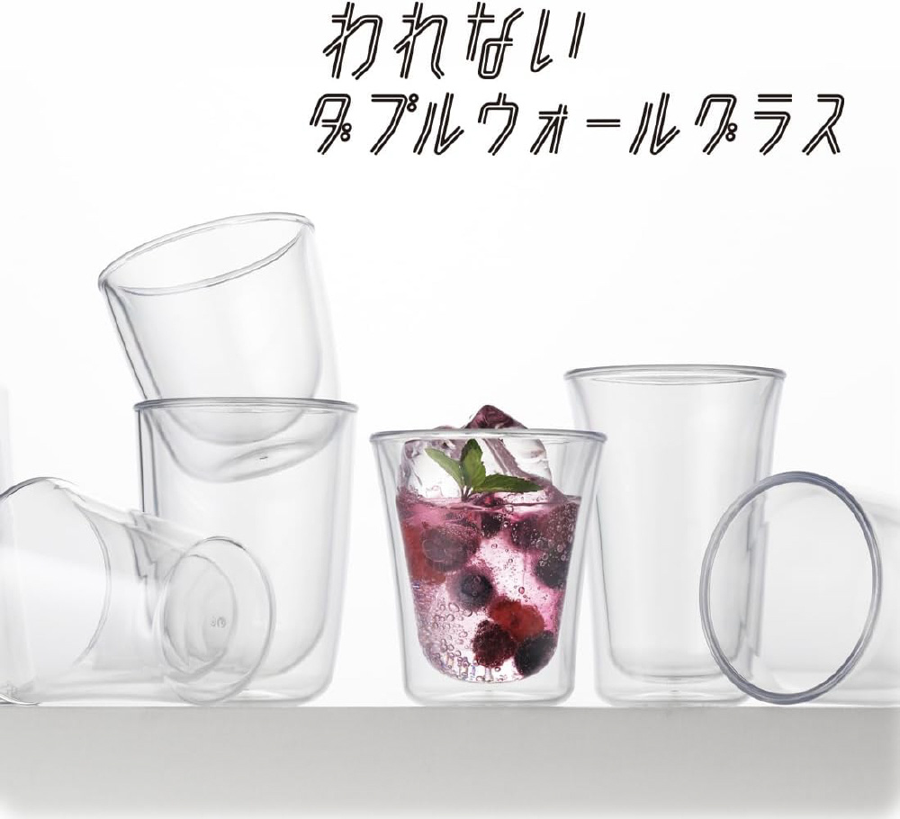 ガラスのように透明でクリア、割れない樹脂製のダブルウォールグラスです。