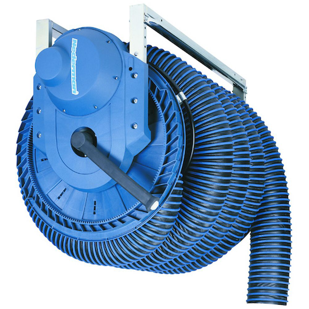 電動式で操作簡単な排気ホースリール。6インチ×7.5mのホースが付属し、作業効率アップに貢献します。