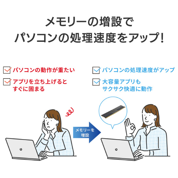 「パソコンの動作が遅い」「アプリを立ち上げると固まってしまう」などと感じたことはありませんか?そんなときは、メモリーの増設がおすすめです。