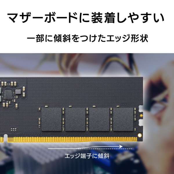 本商品は、エッジ端子部分の一部に傾斜を付けたことによりマザーボードへの装着時に必要な力が低減し、メモリーモジュールの破損や接触不良といったトラブルを防止します。