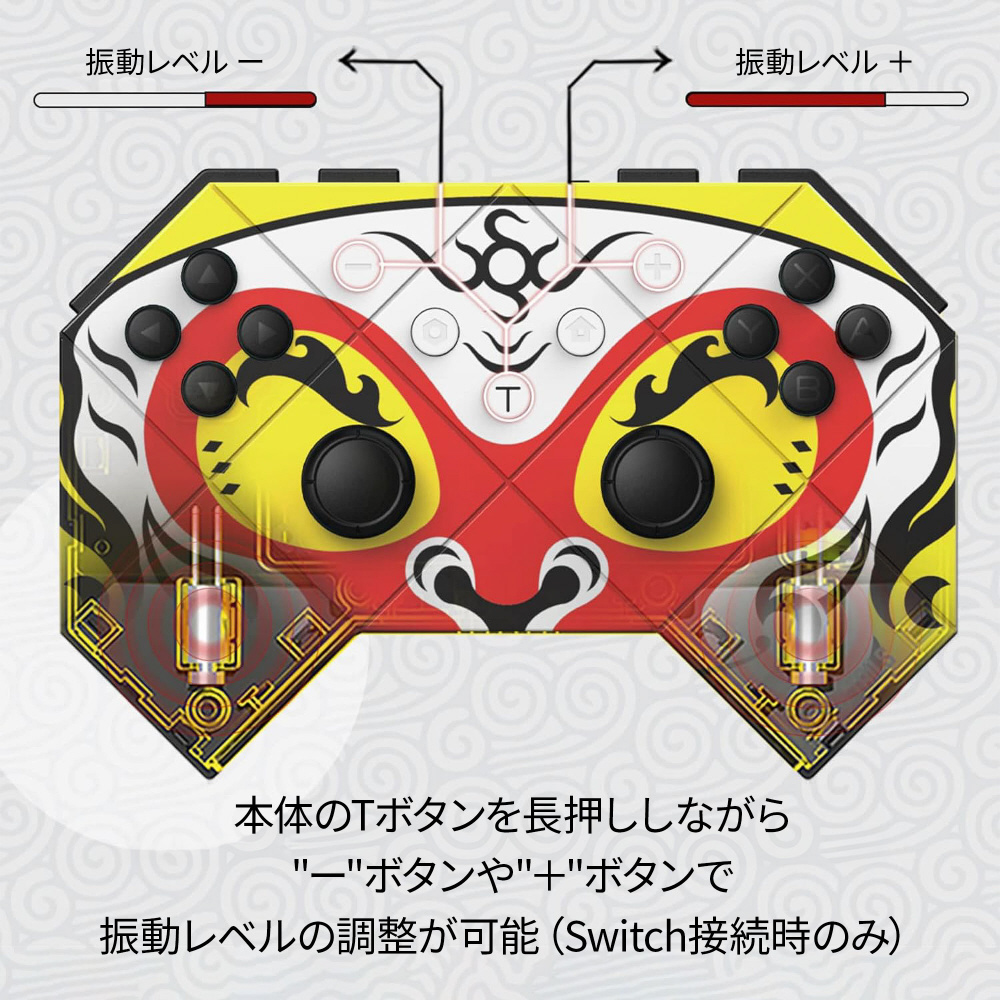 手にフィットするようコントローラーの傾斜角度は135°に設計。従来の曲線的なコントローラーとは異なり、指を添える部分を角張らせることにより疲れにくい新たなフィット感を実現しました。また、6軸ジャイロを搭載しており、柔軟なモーション制御が可能。振動機能対応で臨場感あふれるプレイフィールを味わえます。