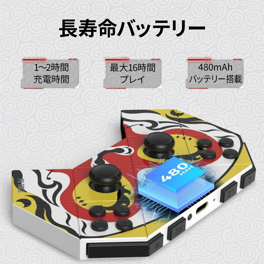 パワーマネジメントに優れたBluetooth5.0接続により、最大16時間動作(リチウムイオンバッテリー容量:480mAh)。有線コントローラーに匹敵する低遅延接続で、違和感のないレスポンスを体感できます。