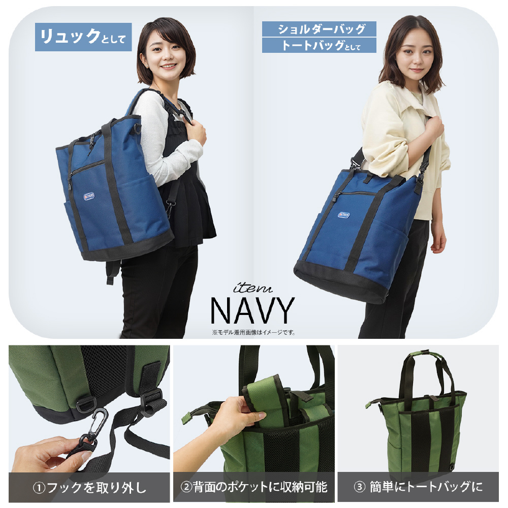 ショルダーバッグ、リュック、トートバッグの3WAYでシーンに合わせて使い分けられます。