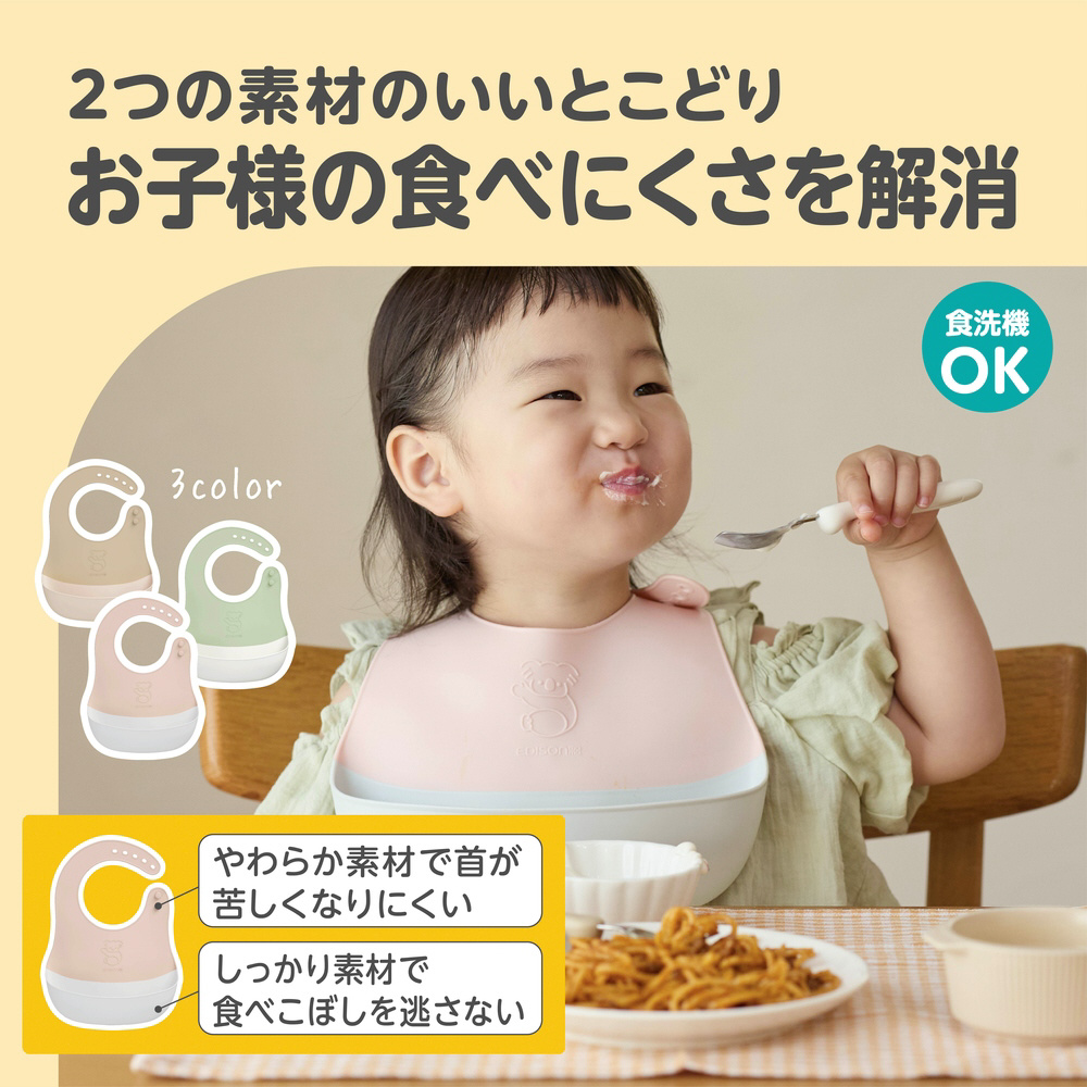 2つの素材を組み合わせ、苦しくなりにくく・食べこぼしをしっかりキャッチできるエプロン