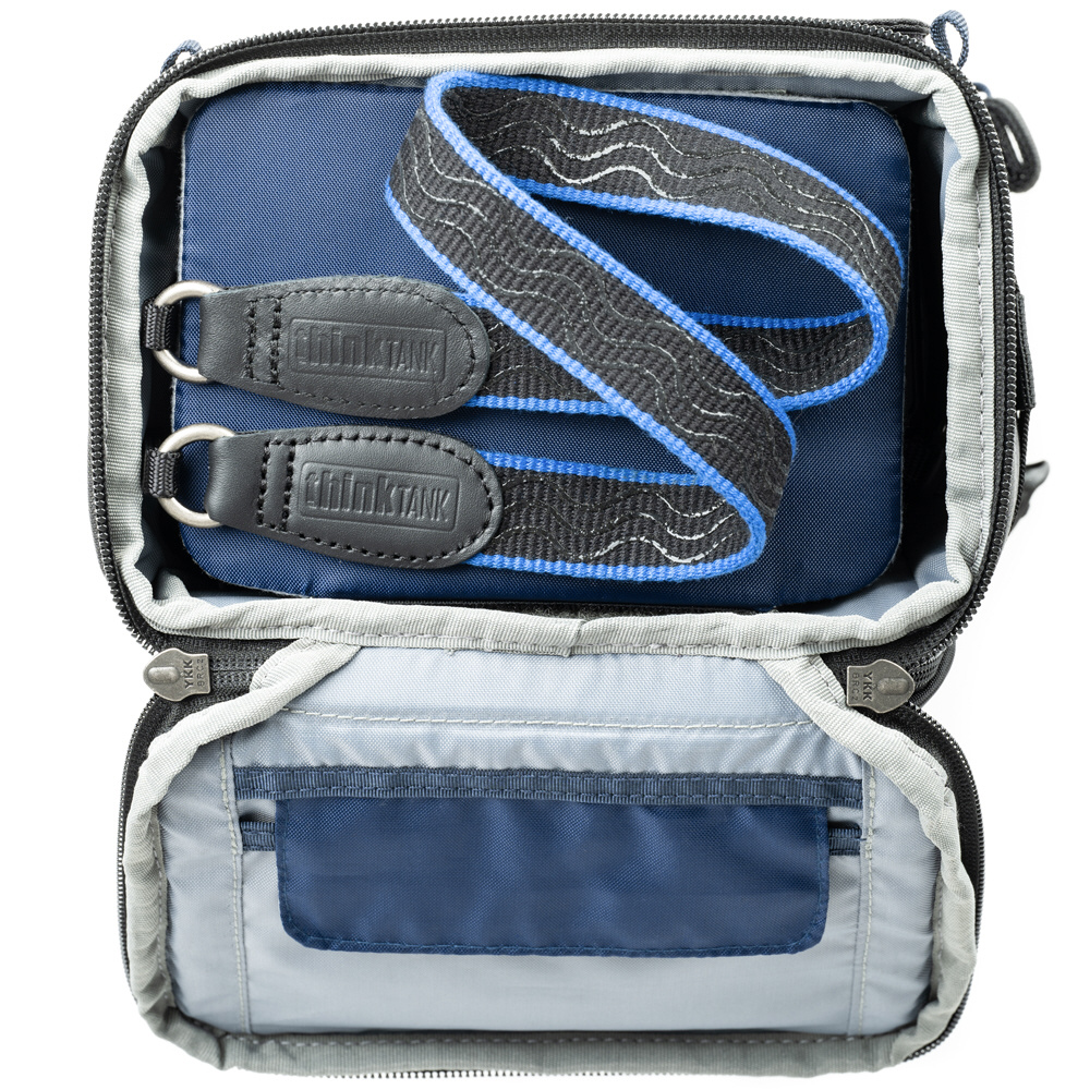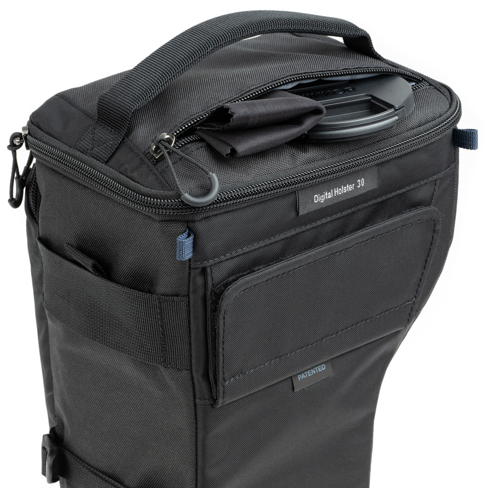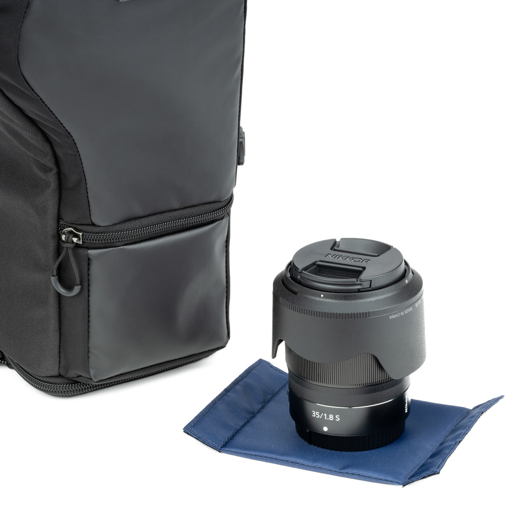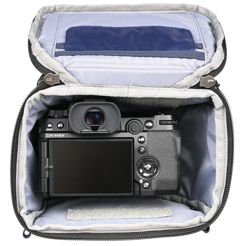 フロントパネルは撥水性と耐久性に優れたTPU素材を新たに採用し、ポケットが加わりました。蓋上部にもジッパーポケット、蓋内側にはベルクロで留められる蓋付きのポケットがあり、レンズキャップやクリーニングクロス、ケーブル等の小物の収納に役立ちます。