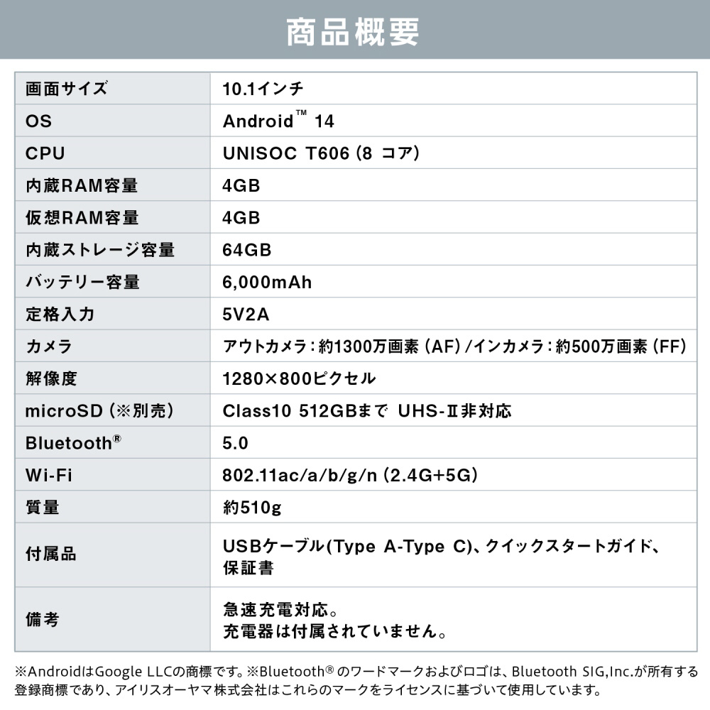 仕様1 ※対応の充電器、コードは別途お買い求めください。付属のコードは急速充電に対応しておりません。
