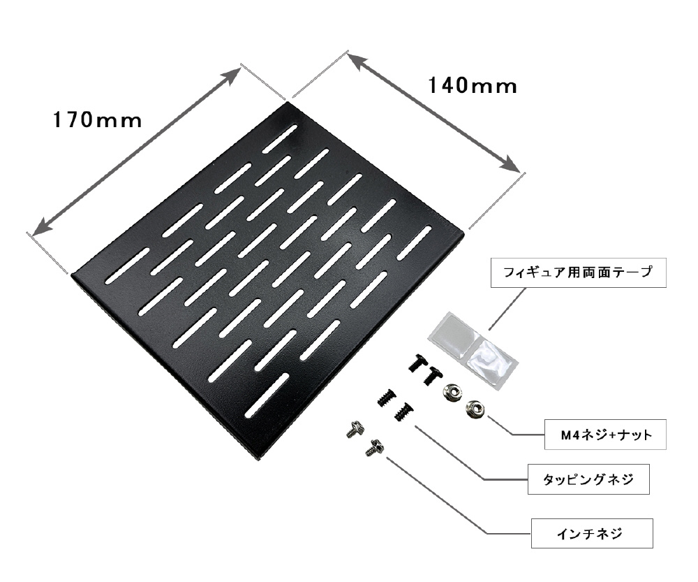 [付属品]タッピングネジ 2本、M4ネジ+ナット 2本、インチネジ 2本、フィギュア用両面テープ 2枚