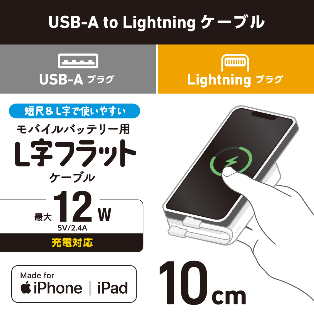 Lightningポート搭載のiPhoneの充電やデータ転送に!モバイルバッテリー用USB-A - Lightningケーブルです。出っ張りの少ないL字プラグと短尺フラットケーブルで接続しやすく、コンパクトで持ち運びにも便利です。Apple正規認証を取得した安心して使用できる製品です。