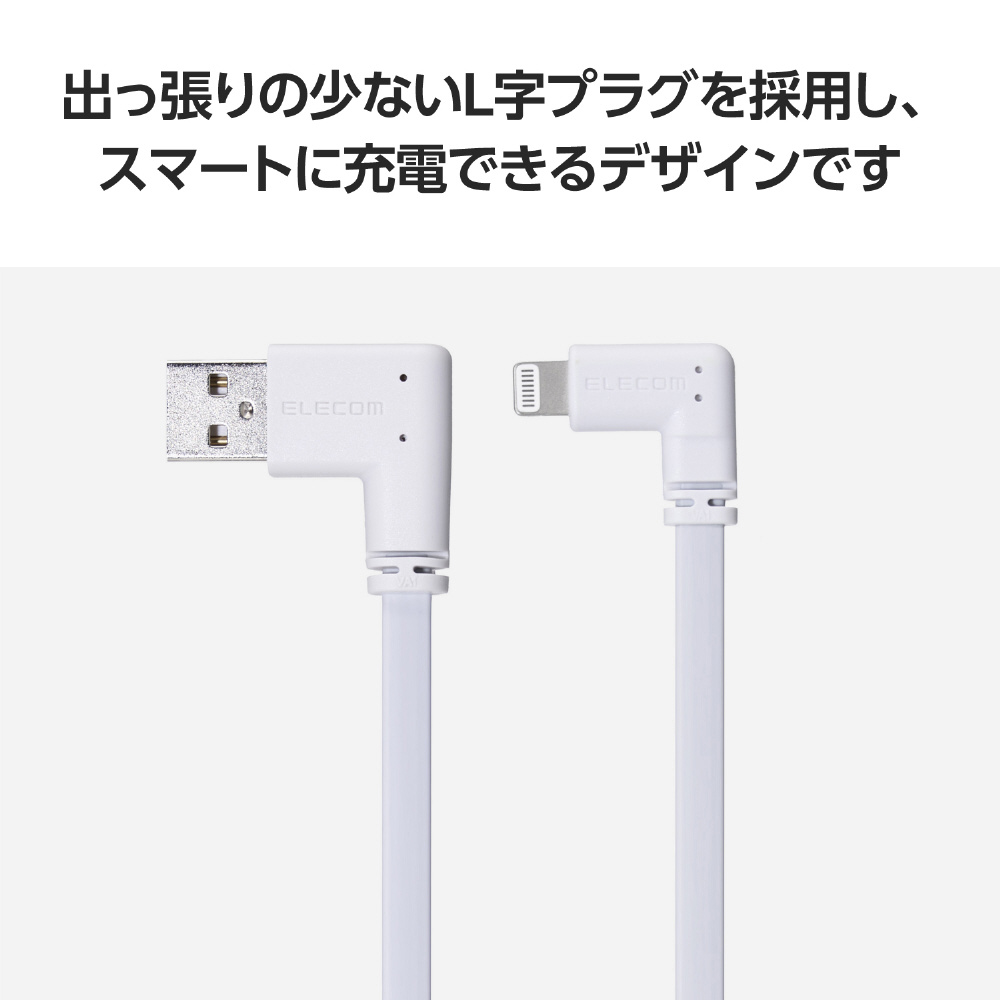 出っ張りの少ないL字プラグを両端に採用し、充電の際に邪魔になりにくい設計です。