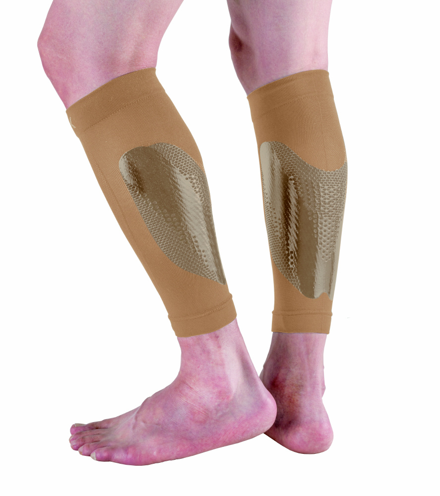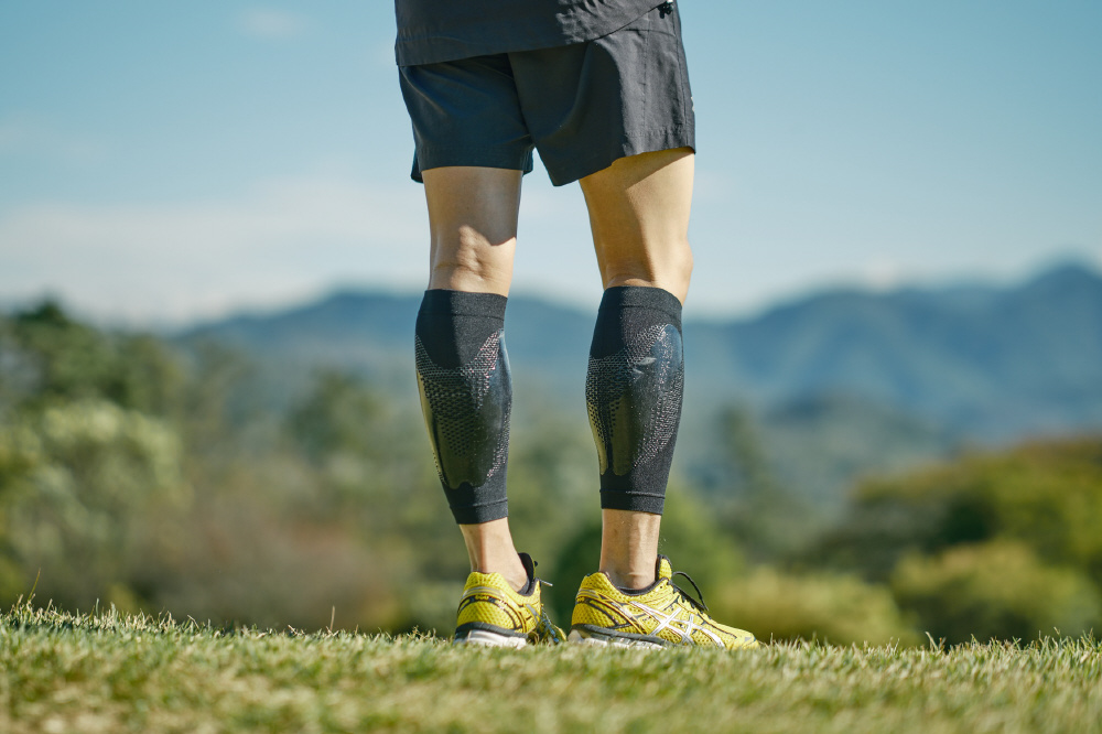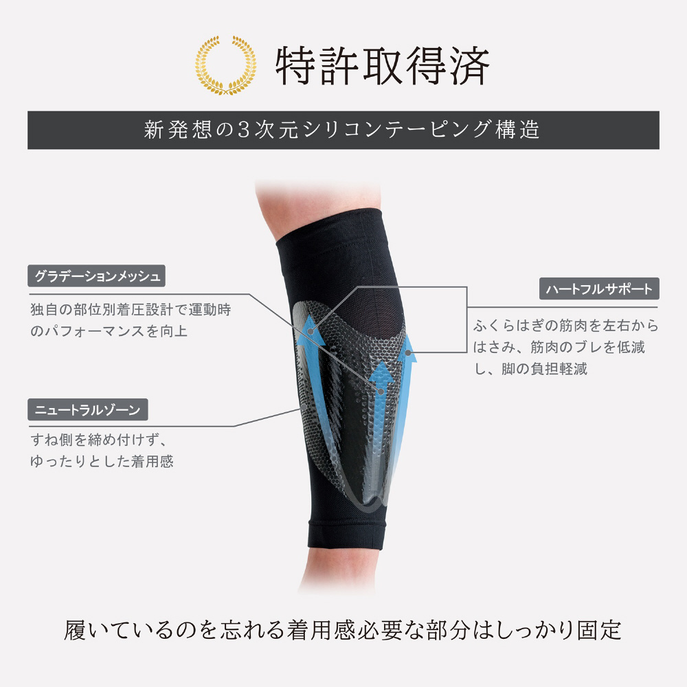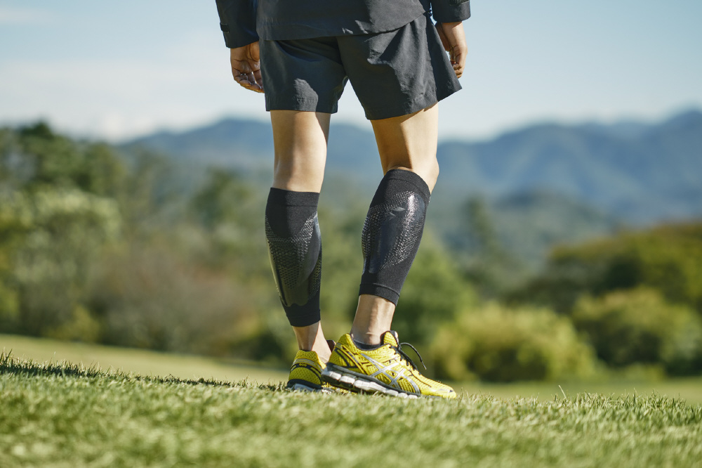 ふくらはぎの筋肉を左右からはさみ、筋肉のブレを低減し、脚の負担軽減