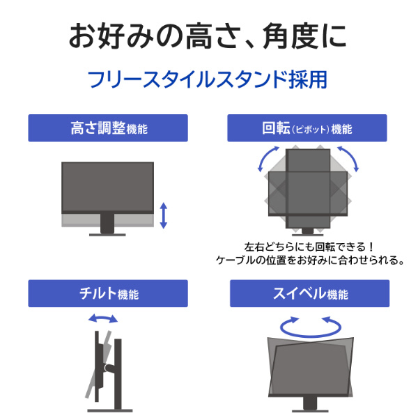 見やすい高さや角度に調節できる「フリースタイルスタンド」の24.5型ワイド液晶ディスプレイです。