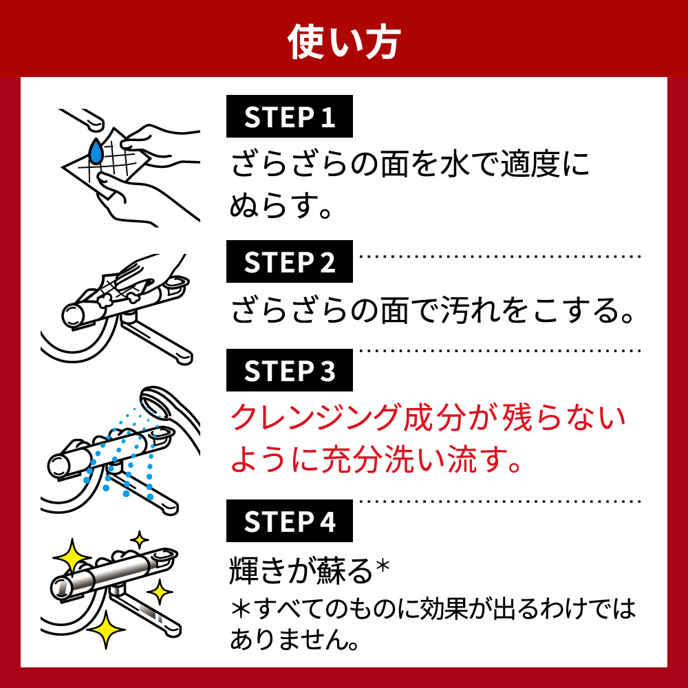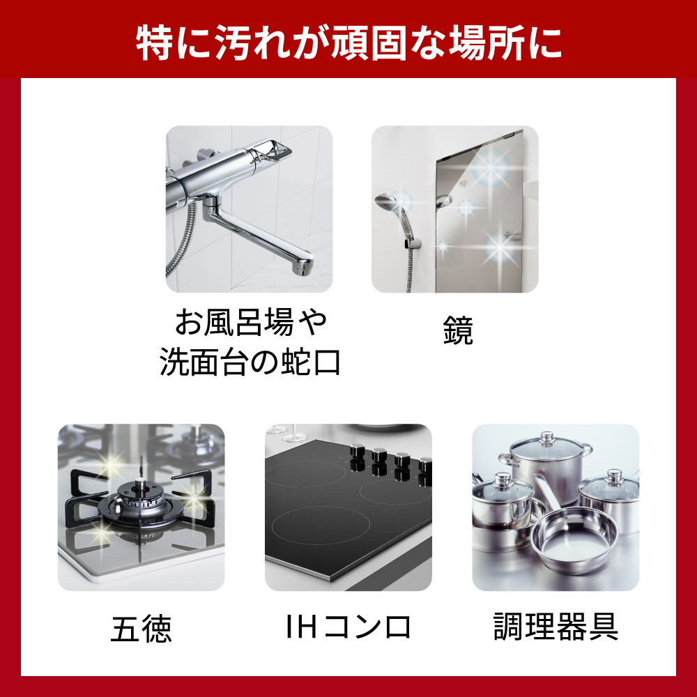 汚れをしっかりはがしとり、新品のような輝き蘇る!浴室、キッチンまわり、調理器具など様々な場所に。