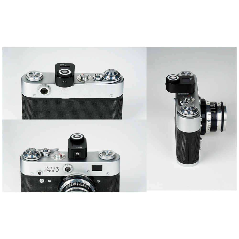 露出計非搭載のカメラにしっかりとフィットし、カメラのアクセサリーシューに装着するか、単体での使用が可能です。操作モードは、絞り優先(A)とシャッタースピード優先(T)をダブルクリックで簡単に切り替えられ、1/3刻みでの精密な調整が可能です。0.66インチの有機ELディスプレイを搭載し、クリアに情報を表示します。また、操作がない場合は自動でスリープモードに移行し、ボタンクリックで即座に再起動します。内蔵された80mAhのリチウムバッテリーは、約10時間の連続使用が可能で、カラーはブラックとシルバーの2色から選べます。